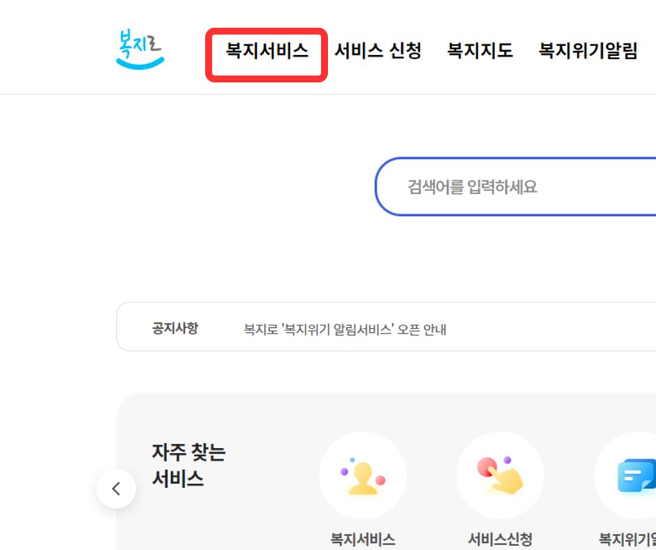 복지로 상단에 "복지서비스"를 클릭합니다.