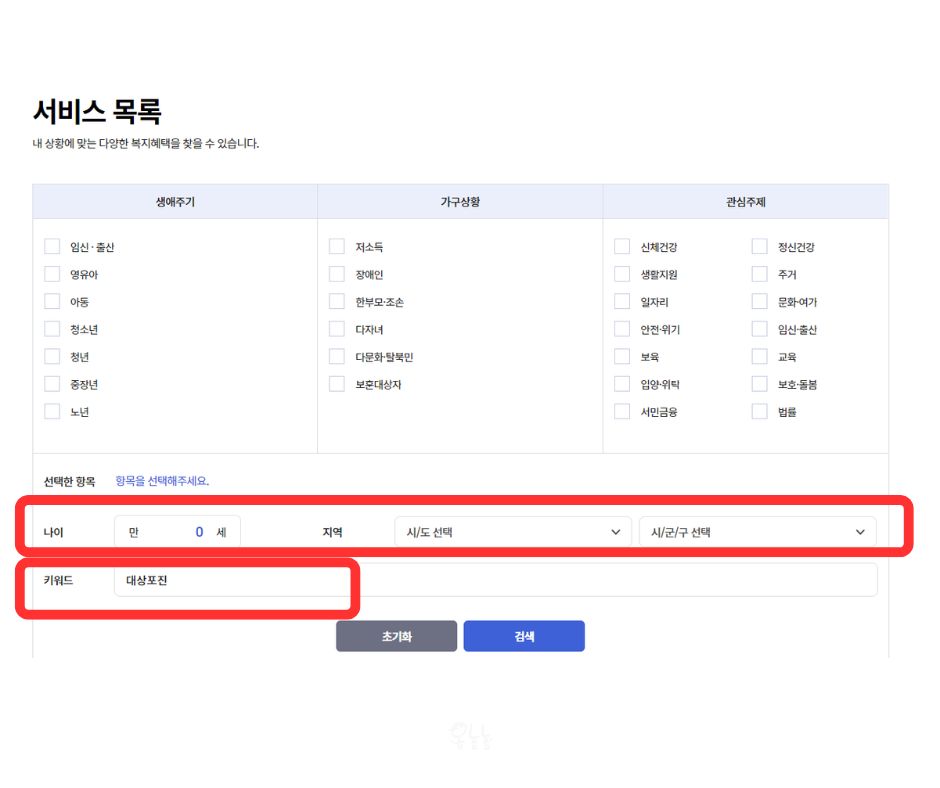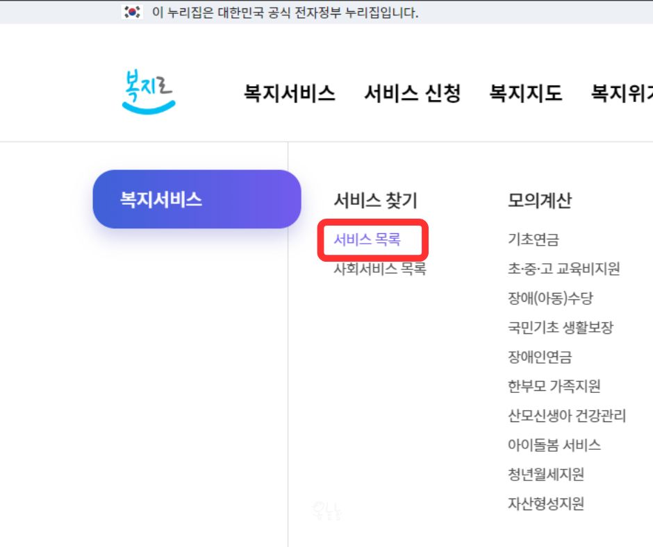 복지서비스 -> 서비스 찾기 -> 서비스 목록을 클릭합니다.