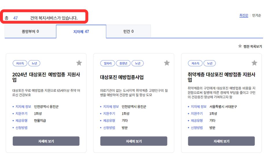 지자체 47건이 검색이 되었네요. 자세히 보기를 클릭하면 지원대상 등 상세한 내용을 확인하실 수 있습니다. 담당 보건소의 연락처도 확인하실 수 있으니 전화로 한번 더 문의해 보세요.