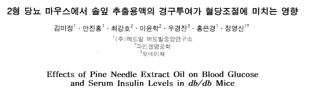 당뇨를 유발시킨 흰쥐에 대한 항당뇨 효능을 조사한 결과 솔잎 투여로 공복혈당이 낮아지고 당내성이 높아지는 경향을 보였습니다. 간기능과 신장기능 중 일부 지표에서 개선 효과가 있었습니다.